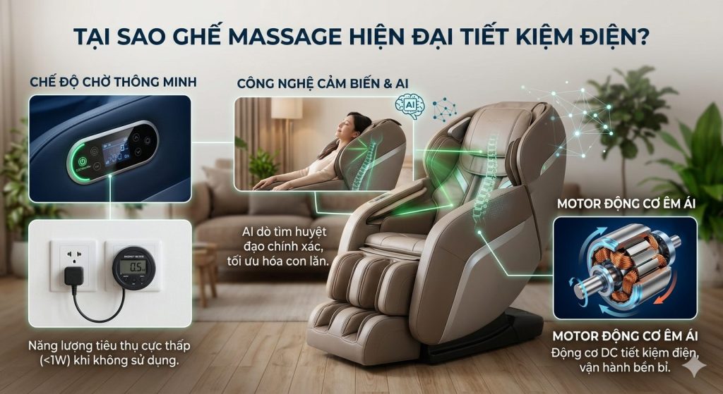 Các dòng ghế mát xa thế hệ mới không chỉ tập trung vào trải nghiệm người dùng mà còn được tối ưu hóa về năng lượng nhờ các yếu tố sau: